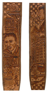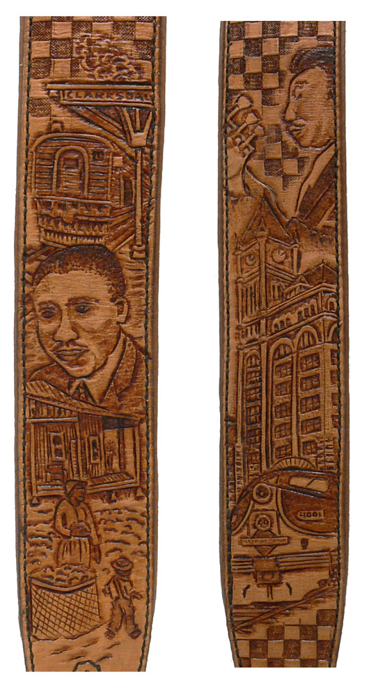 Devant de la sangle : Muddy est né en 1915, dans le Missippi au milieu des champs de cotton. Il vivait dans un cabanon en bois. Ce qui reste de ce cabanon est actuellement exposé au "Blue's Museum" de Clarksadale. A l'âge de 28 ans il est parti en train depuis Clarksade pour Chicago. Derrière de la sangle : Il est arrivé à "Illinois Central", ce qui a du lui paraître un monde bien différent de celui où il avait vécu. Il a eu un grand succès au "Checkerboad Lounge" et a enregistré avec "Chess (jeu d'échecs) records, le pourquoi du cadrillage représentant les jeux d'échecs sur l'épaule. Cette sangle est gravée et repoussée, pas seulement peinte. De cette façon le dessin est en relief et pas prêt à s'user ou disparaître rapidement. J'ai utilisé du cuir tanné végétal italien (peau de vache)de 3mm d'épaisseur, ensuite doublé de 3 mm de Neoprene (qui retient la forme) et recouverte de peau de cochon (genre peau de daim). L'attachement consiste d'une boucle de métal recouverte de peau de kangourou. Les trous de bouttons sont renforcé avec de la peau de kangourou également. Le tout est cousu à la main avec du fil nylon ciré de sellier |
