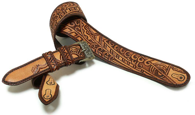 Cette sangle de guitare est gravée et repoussée à la main dans un cuir italien tanné végétal de 2.5 mm d'épaisseur. Le dessin du devant est répété sur l'arrière. Elle a été