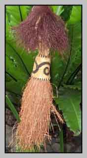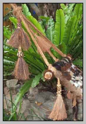 Strips of cow skins and coconut fiber rope with raffia and burned gourd hangers