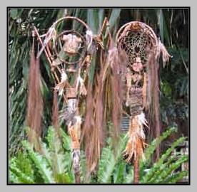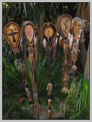 Ownership staafs. Rawhide, stretched on cane, decorated with feathers and Horse Hair